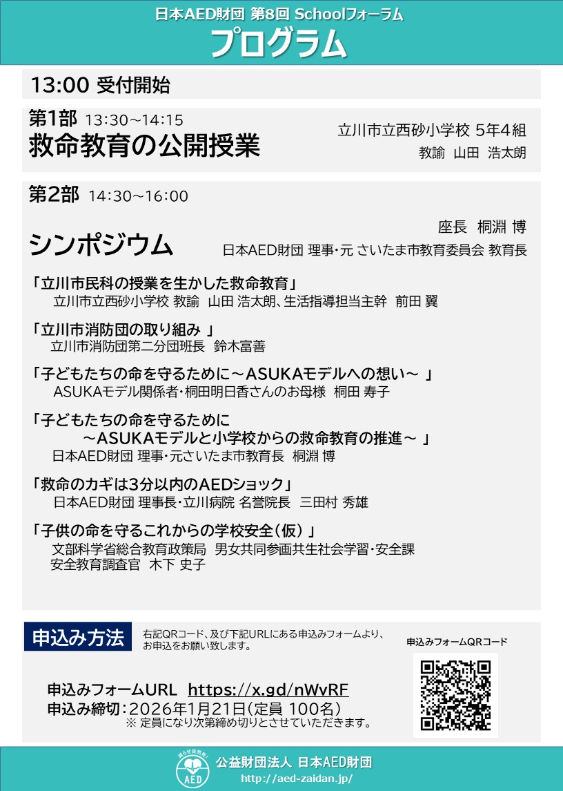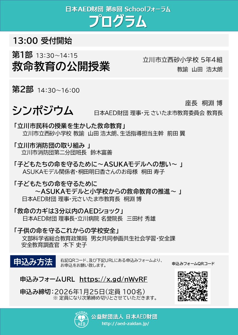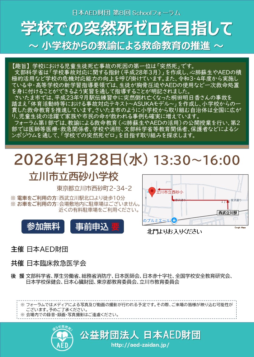 第8回 日本AED財団Schoolフォーラム を2026年1月28日(水)に開催することを決定いたしました。