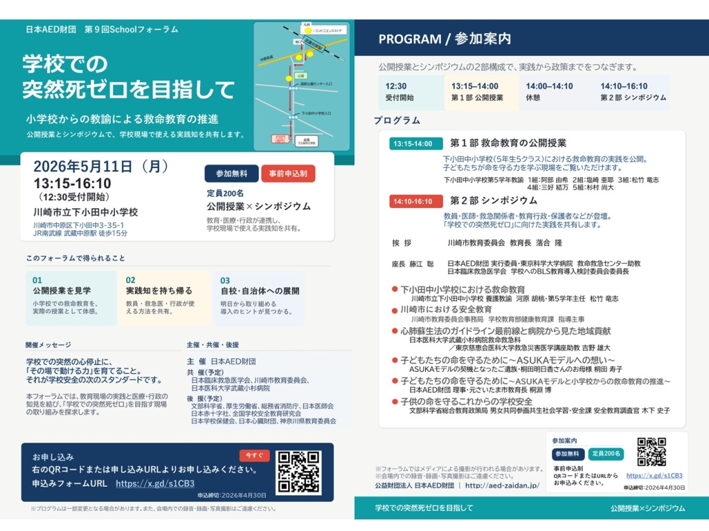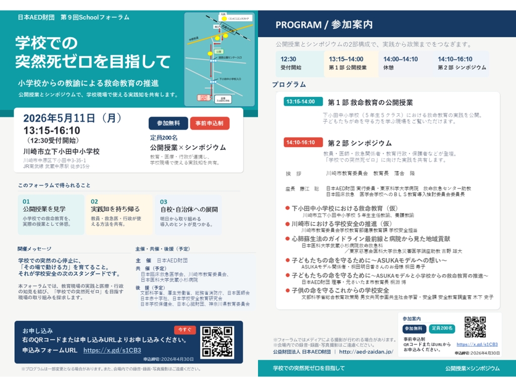 第9回 日本AED財団 Schoolフォーラム 学校での突然死ゼロを目指して~ 小学校からの教諭による救命教育の推進 ~を開催いたします